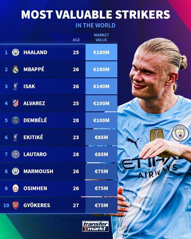 在完成最新一次身价更新后,德国转会市场网站列出了世界足坛中锋身价榜,哈兰德1.8亿欧居首,姆巴佩紧随其后。